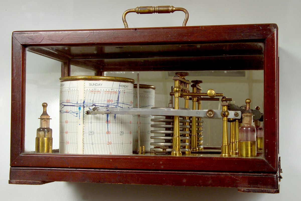 It has a drum with an 8 day clock, with a chart showing the seven days of the week along the top, with the hours, and vertically it shows both the barometric pressure and temperature scales.