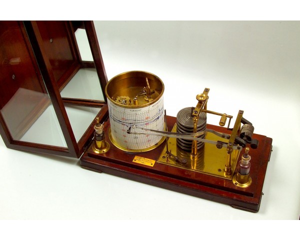 This barograph, or recording barometer, also incorporates a thermograph, or recording thermometer. It is approximately 12" x 6" x 6", has glass on 4 sides, including the top, and a mirror back to reflect the mechanism.