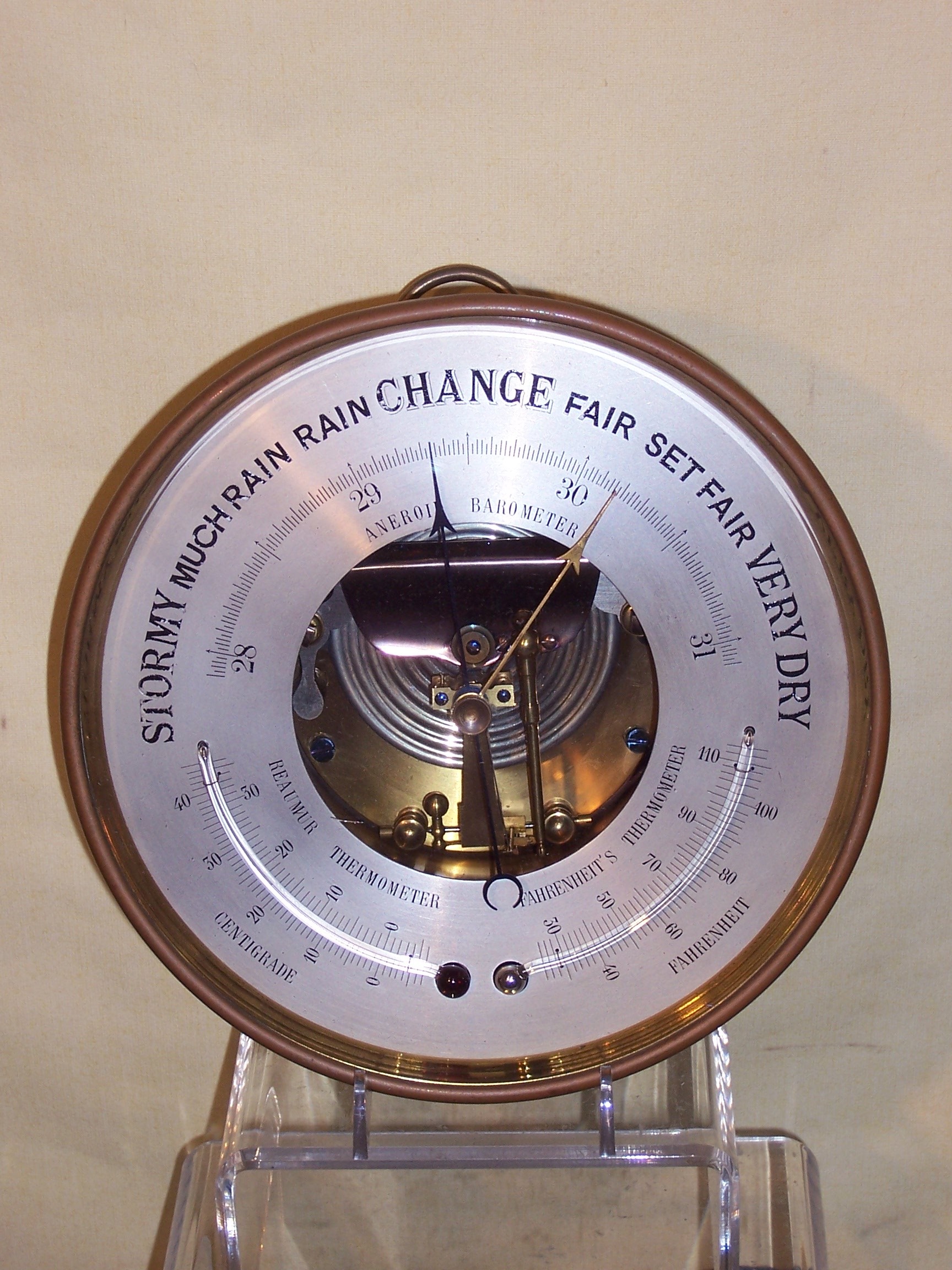 aneroid barometer in 8 inch diameter brass case with hanging ring at the top. The scale is of silvered brass with weather measurements in the top half and twin alcohol and mercury thermometers in the lower half. The glass, with brass pointer at the centre, has a beveled edge, and encloses the mechanism with the original blued-steel screws, lacquered brass and steel which is visible through the centre of the dial. Functional barometers were not made any better than this.