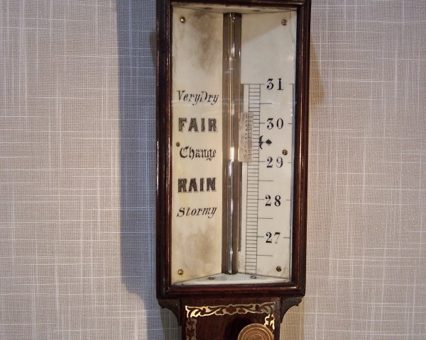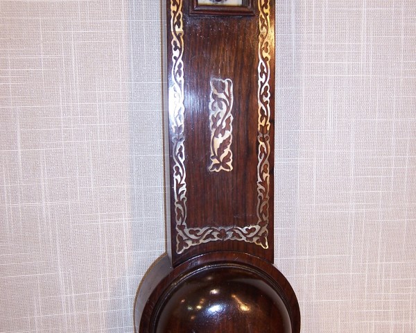 A rosewood stick barometer with inlaid mother-of-pearl and ivory scales. The case with a cushion top and manually operated vernier by bone knob just below the scale. The original cistern cover is from solid rosewood, and the mercury thermometer is also original.