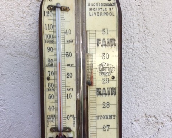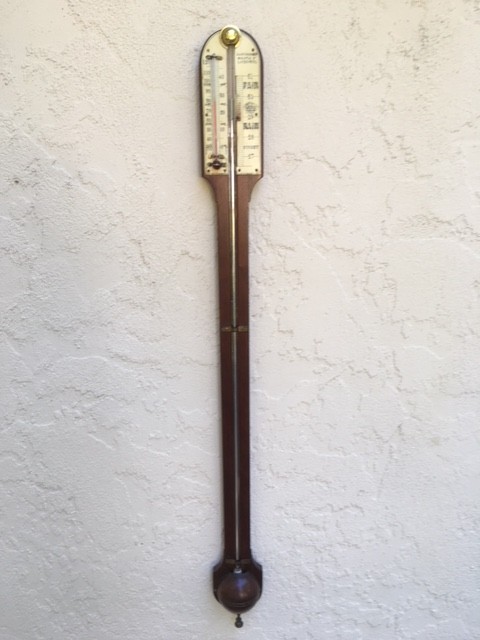 A simple round top solid mahogany stick barometer with "ivorine" plates and vernier, and alcohol thermometer. The maker is Aronsberg & Co. of Liverpool. Typical of many barometers made at this time in the late 19 th century out of solid oak, mahogany or rosewood. This one has an attractive look, with both the wood and the plates in good condition, and a nice color.