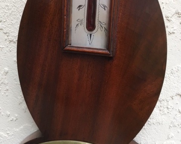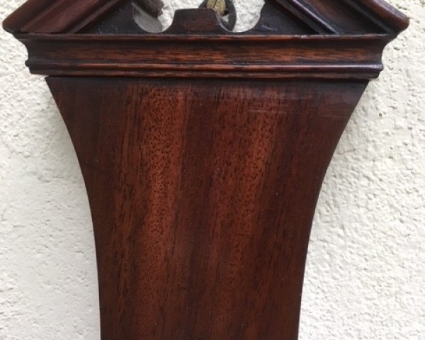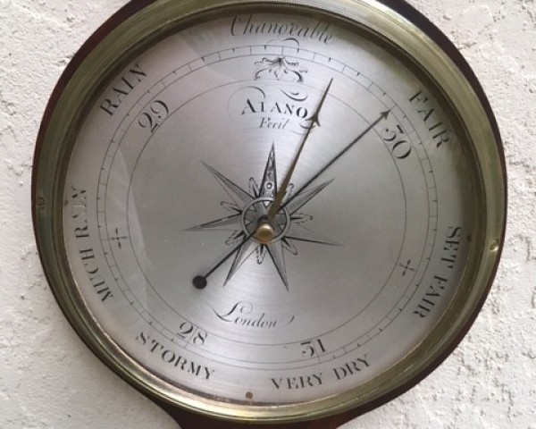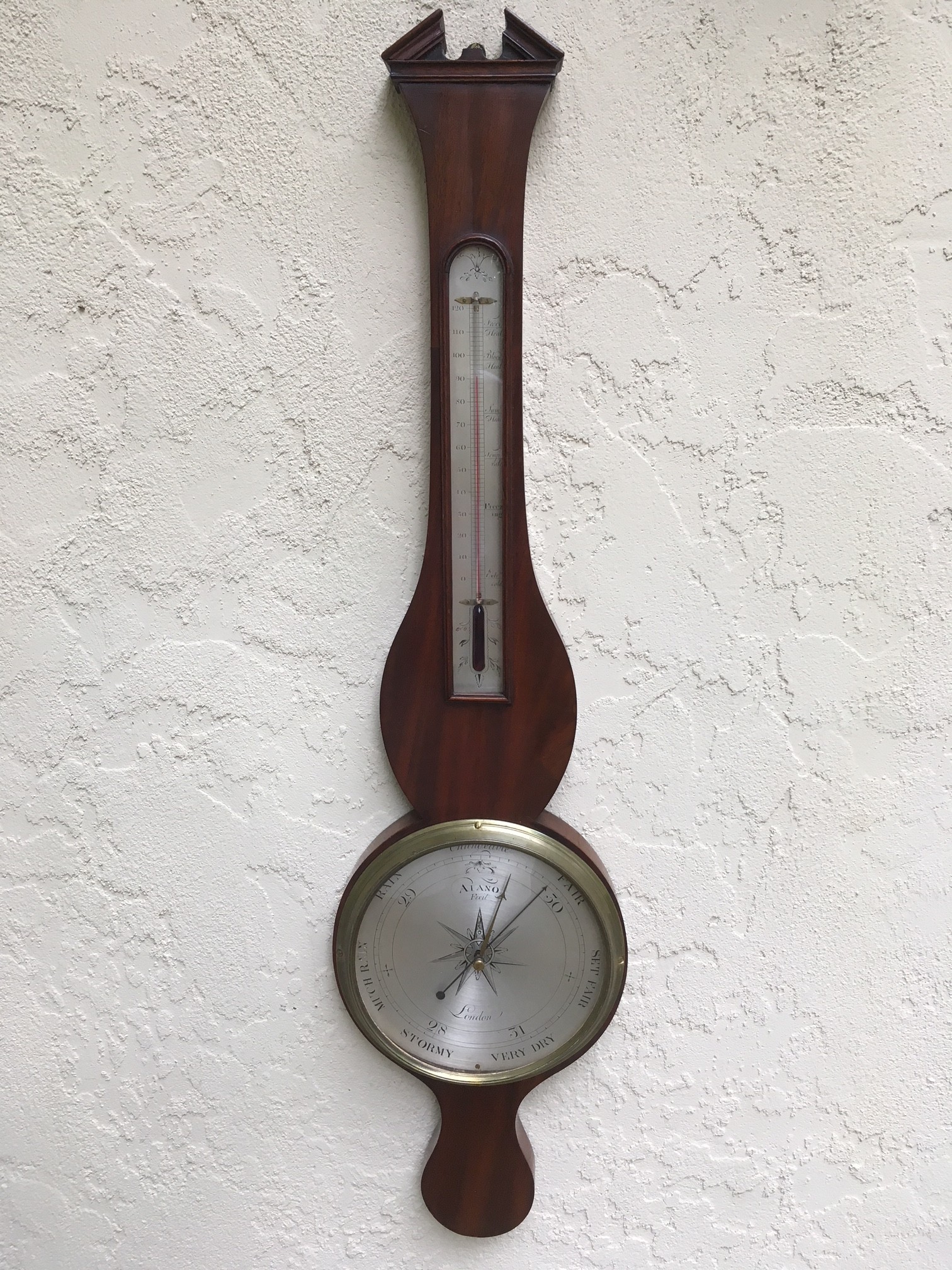 This barometer, in spite of having no inlays (or paterae), has an extremely modern and elegant shape, simply because it has no shoulder, the vertical part just below the top pediment.This is a most unusual design, found on only a very few early (around 1790-1810) antique barometers. It starts with an architectural pediment, over long straight grain mahogany veneer, with a long alcohol thermometer and the wonderfully engraved 8" silvered brass main dial, with the maker's name. Note also the word "changeable" at 12 o'clock, indicating a date prior to 1803; the proximity of the brass bezel to the edge of the case, and the fact that there is no edge stringing, which adds to its modern look. The name is Aiano, and beneath that is "fecit", which is latin for "made it". Charles Aiano was working in London 1790-1820, and made many good quality barometers before moving to Canterbury later.