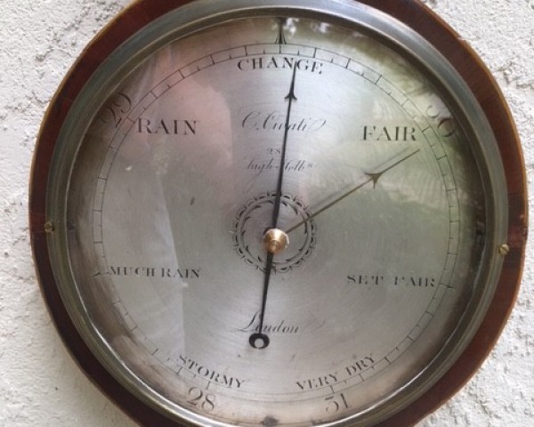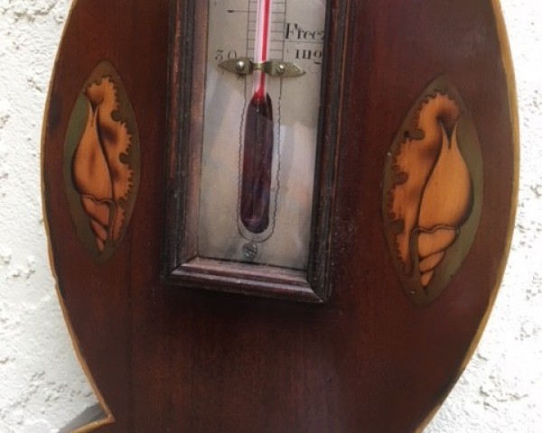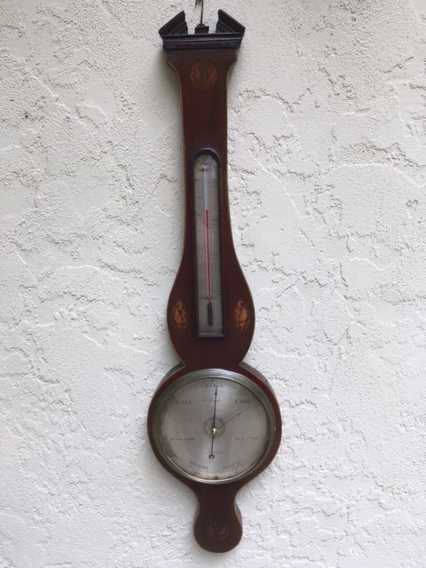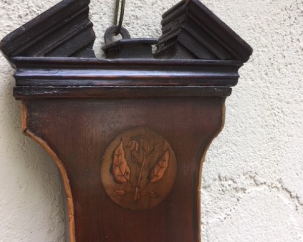 An early variation on the Sheraton wheel barometer, having horizontal writing and a short shoulder (the vertical distance from the top inlay to the pediment, about 1 inch). It also has conch shell inlays at the sides, with the green of the sycamore wood still showing, as well as flower inlays at top and bottom. A finial could be added if required.