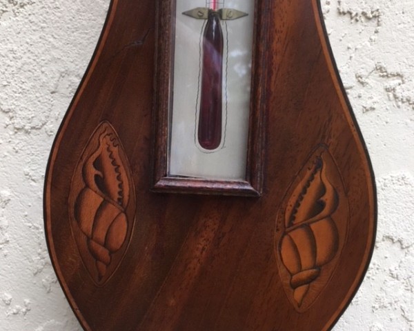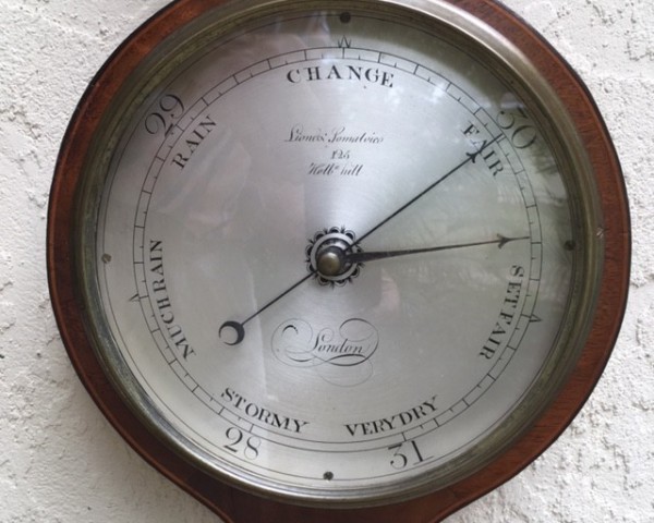 This particuar barometer has a good clean surface, with all original inlays and edge stringing, and (like all my barometers) is fully working. The mahogany veneer is a warm color, not too light and certainy not too dark, and both dials have been re-silvered; it could have a cast brass finial if desired.The maker is one of the best, Lione & Somalvico, of 125 Holborn Hill, London, and it dates to around 1815 and is priced $1700.
