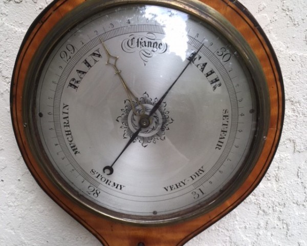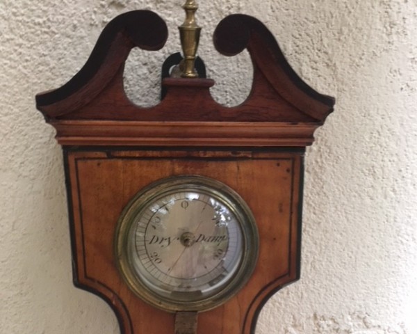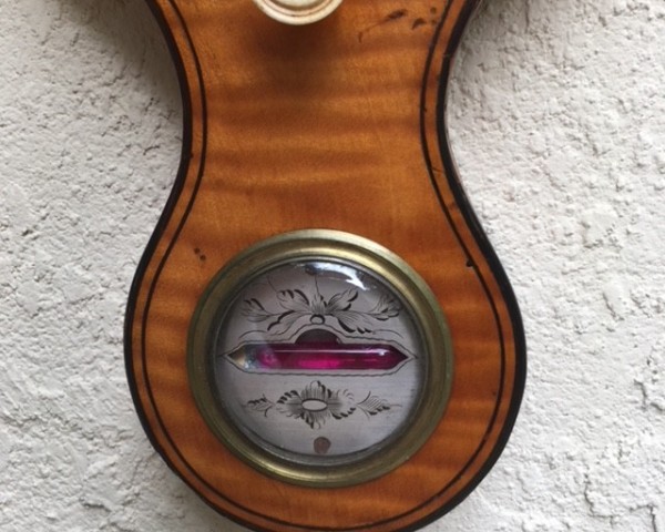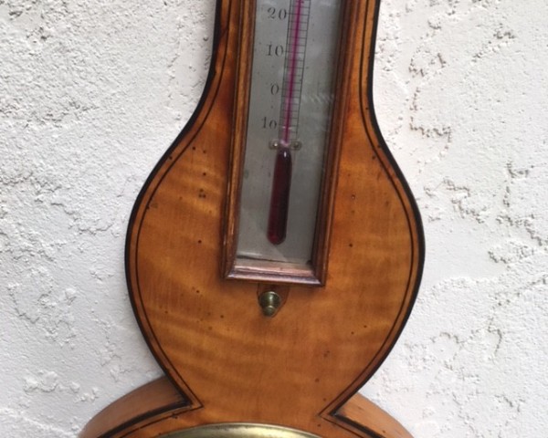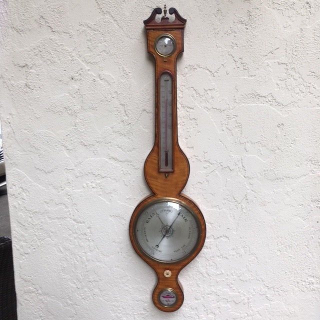 A satinwood veneered, 8" dial, wheel barometer with boxwood and ebony double edge stringing. Pale wood barometers are relatively rare as most have darkened over time, and satinwood is the palest of veneers, often being confused with tiger maple in appearance. The swan neck top is of solid mahogany, and so is darker; these pediments were seldom made with matching veneer. Below that is the hygrometer, a long alcohol thermometer, the 8" main dial with indicating hand (blued steel) and the set hand (brass), over the spirit level.