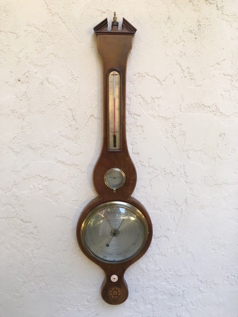 A Sheraton 3 dial mahogany veneered, mercury wheel barometer. Architectural top pediment with cast brass finial, over long alcohol thermomter, over central hygrometer. Note the small clip holding the hygrometer in place; it is made of cast brass, instead of the more usual (on 5 dial barometers) pressed brass. This is always a sign of quality. The hygrometer itself is nicely engraved, and is slightly deeper than the usual one, to go with the deeper clip.