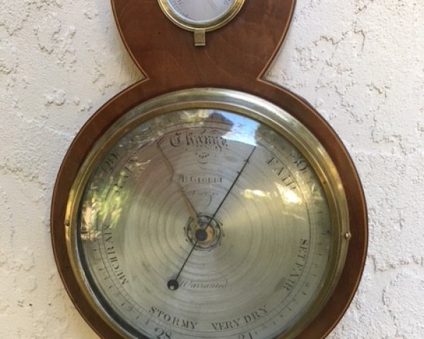 The 8" diameter main dial is engraved in the early manner, with major divisions in 1/10 and 1/20th inches, and minor divisions in 1/100th inches; it is signed B. Giobbi of Devizes in England (working 1810-1845). Beneath the main dial is the set hand knob (replaced), and under that, a sunburst paterum/inlay. The case itself, of finely figured pale mahogany veneer, is on a carcase of pine (as usual) and has an edge of boxwood and ebony stringing. Altogether a very nice and refined example of a working Sheraton barometer, with the most unusual central hygrometer.