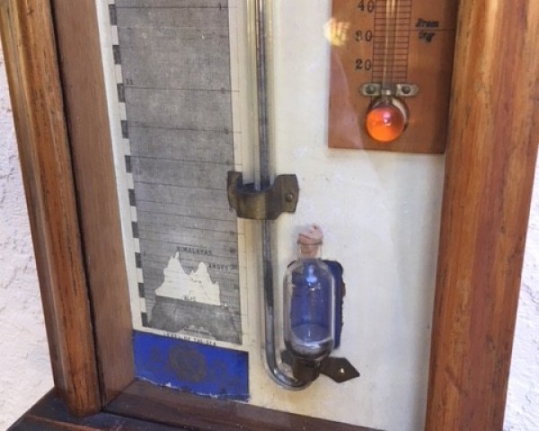 A nice example of Admiral Fitzroy's barometer, in pale oak, with all of his weather annotations. The case is of solid oak, with a paper backboard, large bore glass tube with mercury, and twin pointers operated by externally mounted knobs. There is also a round bulb alcohol thermometer. Fitzroy barometers were all made after his death, and this one dates to around 1880. He was responsible for attempting to put the World-Wide Weather on the map, by coordinating weather reports from multiple locations, in REAL TIME (long before the internet!) in London.