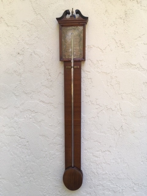 Mahogany, veneered on pine, stick with solid mahogany oval cistern cover; horizontal veneer; and a paper register plate under glass. Note the word "changeable" on the plate: this is usually an indication of pre- 1805, but in this instance is probably not. The oval cistern cover is indicative of Scottish barometers. A fine but simple stick barometer in excellent original condition, with a warm mahogany color.