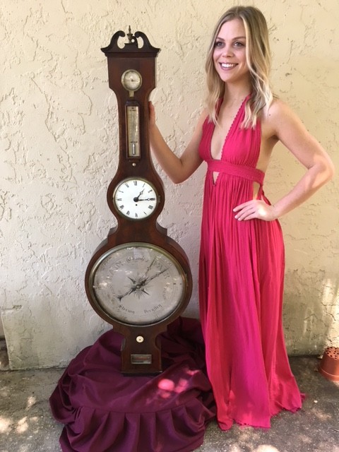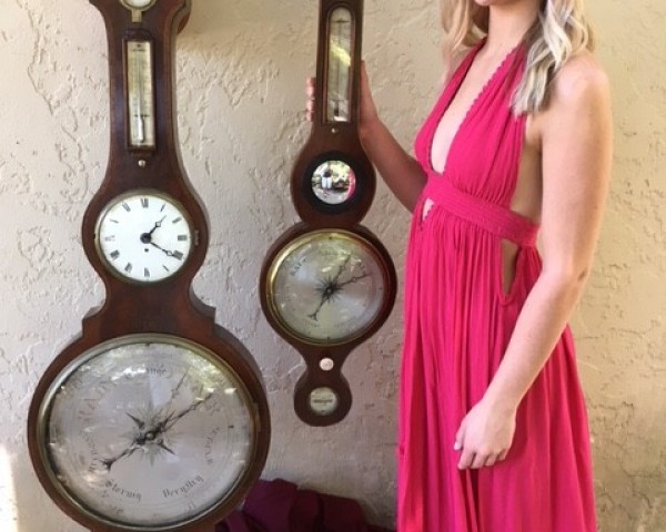 Wow ! The biggest barometer ever! It measures 55 inches tall by 16 inches wide, and has a main dial of 14". The model standing with it holds a standard 37" x 10" 5 dial banjo barometer....not a miniature. It was made by Anthony Pagani of Nottingham, England, (working 1818-1825, at Goose Gate, Nottingham) and has a swan neck pediment, over the hygrometer, over a bow-front thermometer. The clock has the original dial, hands, and bezel, but the mechanism has been replaced, as usual, and the main barometer dial, also with original hands and bezel, is below. There is a rectangular level beneth, engraved with the maker's name and city. The case is of figured mahogany (on pine) with cross banding at the edges. A truly exceptional piece!