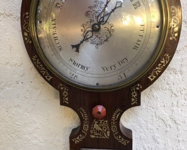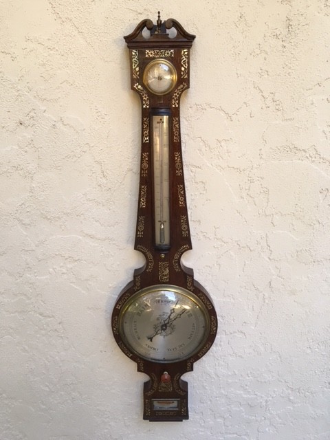 A rosewood 4 dial wheel barometer, with fancy mother-of-pearl inlay around the edges, and a swan neck top pediment.There is a cast brass finial centering the pediment, and a hygrometer beneath; under that, a detachable bow-front mercury thermometer, and an 8" diameter dial. A knob to operate the set hand, and a rectangular brass bezel covering the spirit level, marked "Warranted Correct" are at the bottom.