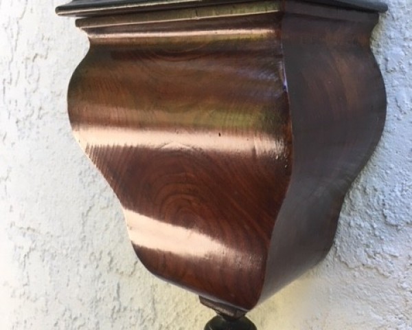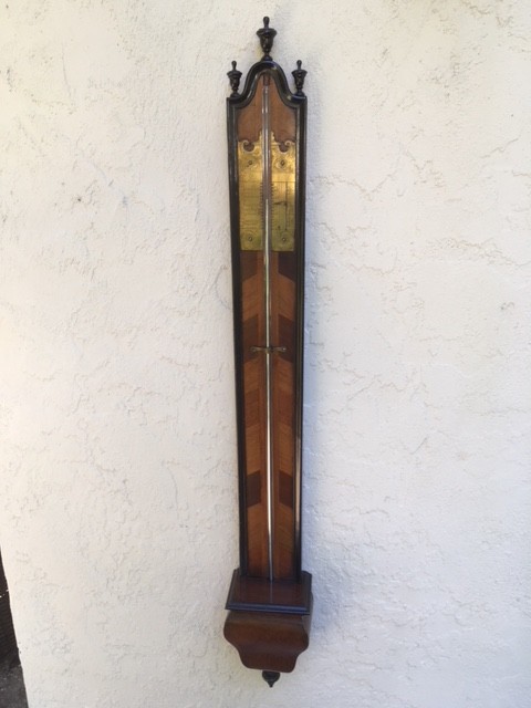 An extremely early and rare barometer, dating to around 1720-1730, with a beautifully engraved brass register plate. The barometer is French, and is made of what appears to be dark and light walnut, applied in a chevron style over a fruitwood base. The cistern container at the bottom is made from the "bole" of a tree, possibly cherry, with a wonderfully natural wood-grain showing where branches woud have originated; it is a massive, single piece of wood, hollowed out. This barometer has been in my personal collection for many years, and is being offered for sale for the first time.