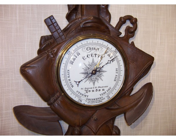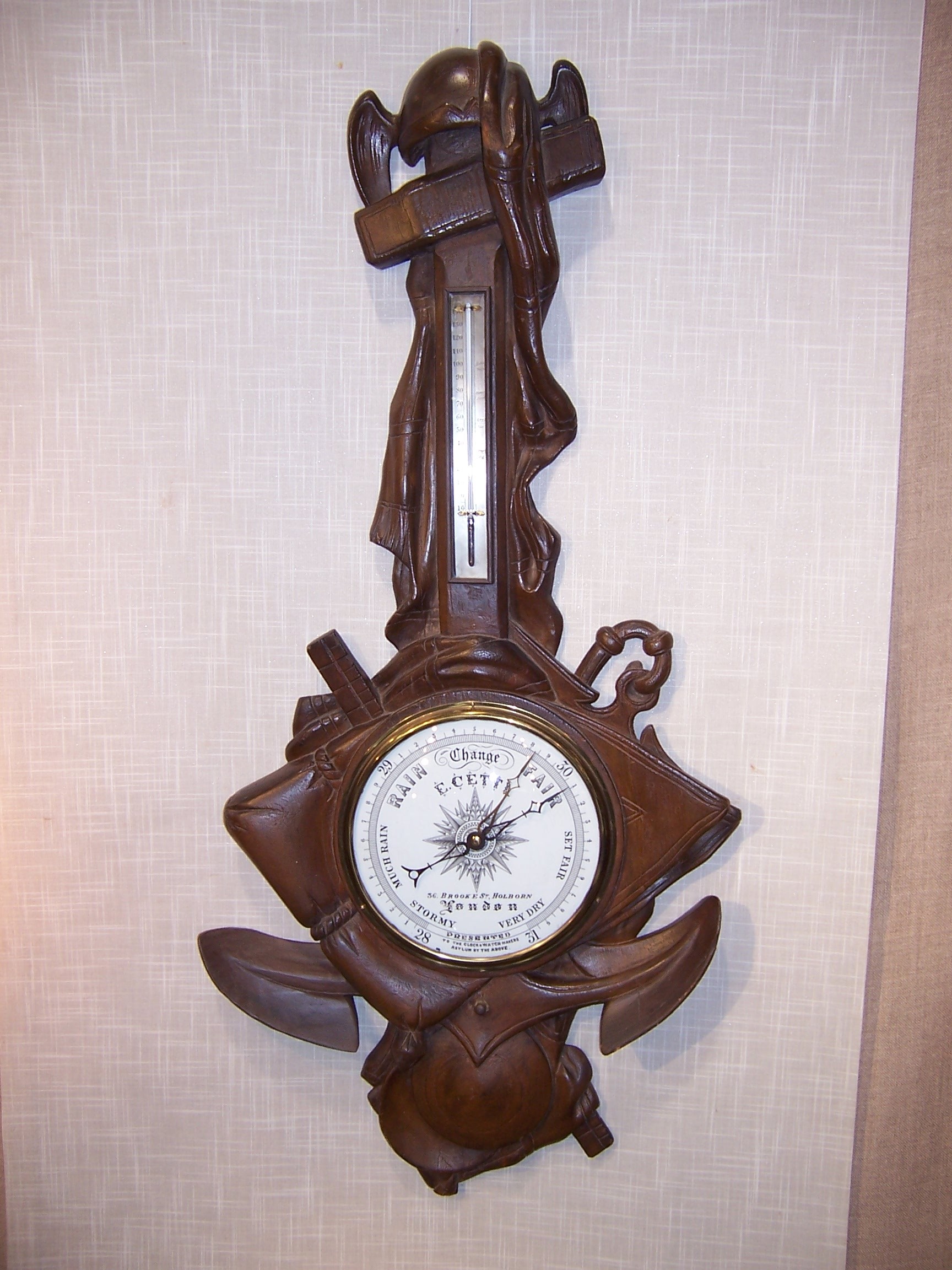 The top dial is a mercury thermometer on a silvered register plate, and below that is a white porcelain dial signed E. Cetti, 36 Brooke St., Holborn, London (working at this address 1883-1895). At the bottom of the dial is written: Presented to the Clock and Watch Makers Asylum by the above.