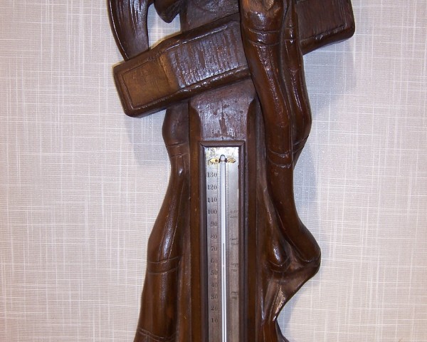 Very large carved wood case, showing Mercury′s winged helmet at the top with drapery, and an anchor; ruler; attache case; and ?.
