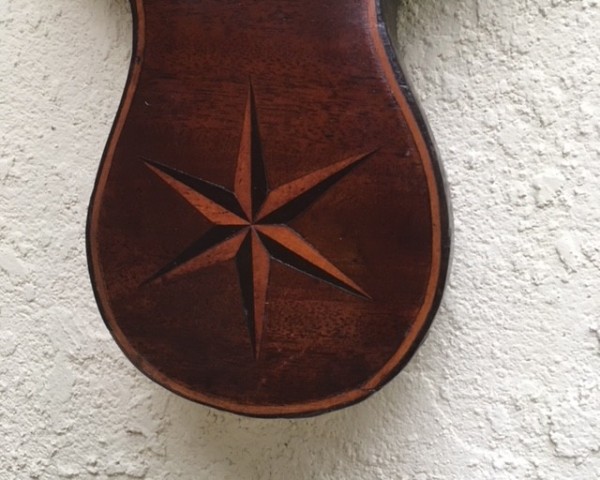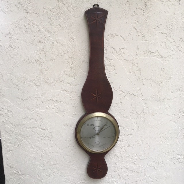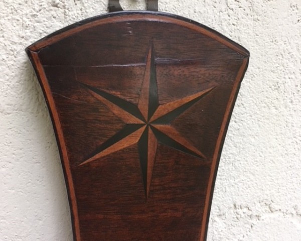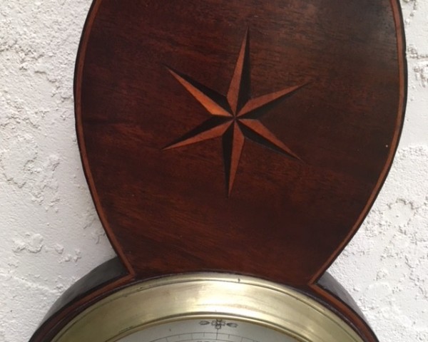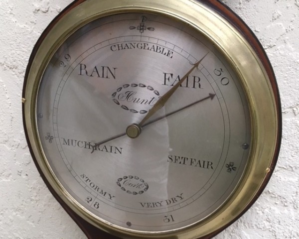 Rare, late 18th century, Irish wheel barometer with 3 inlaid stars of boxwood and ebony, and a silvered brass 8 inch dial engraved with the usual weather indications, but inscribed horizontally, and with "changeable" at 12 o'clock. The famly name Hunt, of Cork (in south-west Ireland) is well known as makers of scientific instruments from 1792-1812 (father), and 1820-1828 (son), and this barometer would undoubtedly have been made by Hunt senior prior to the end of the 18th century. One of the Hunts evidently worked with Thomas Bennett, also of Cork, who set up in business in 1810; see another wheel barometer (by both makers) m1542.
