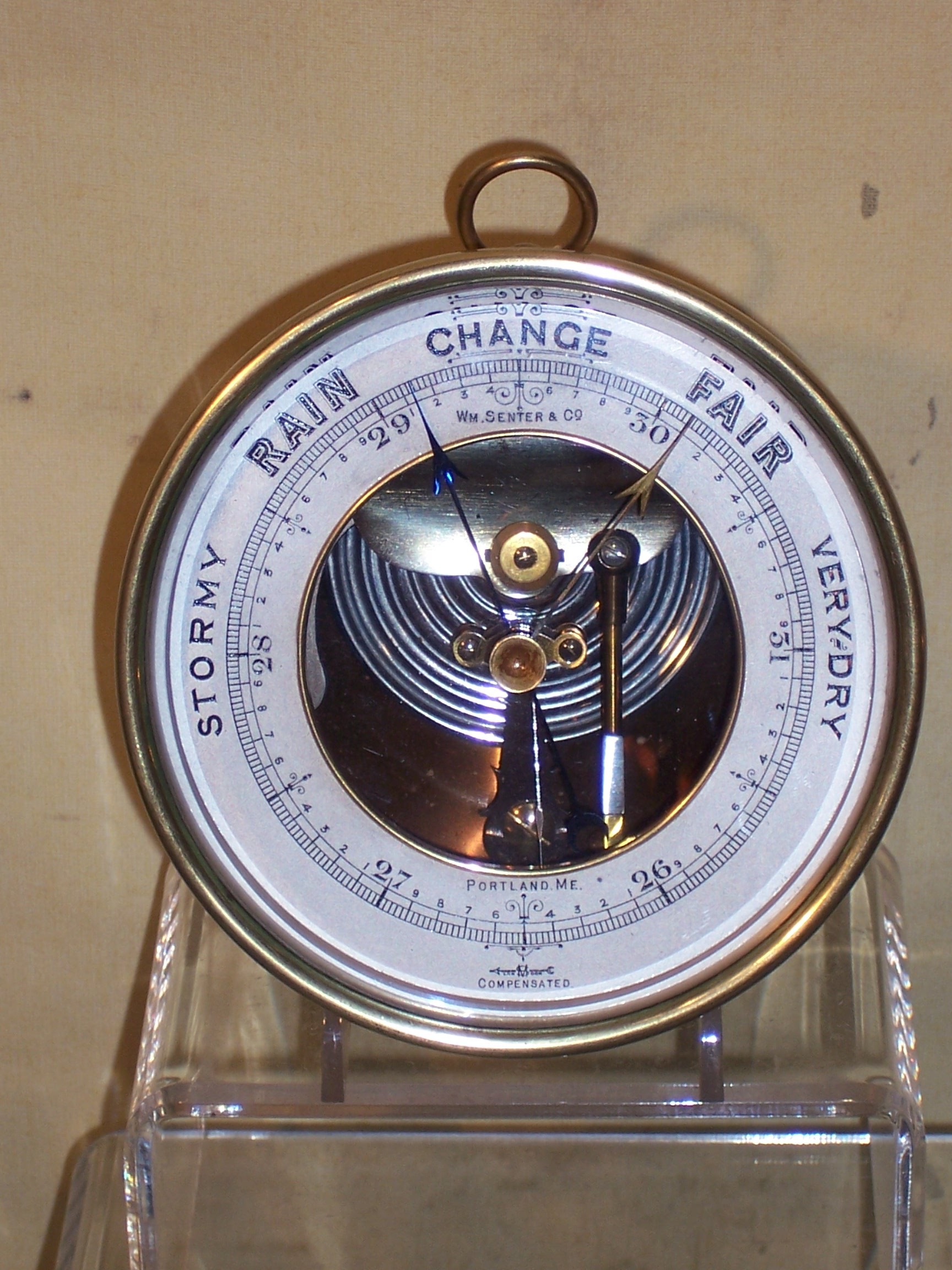 5 inch polished brass case aneroid barometer with engraved silvered brass dial, visible mechanism, beveled glass and a hanging ring. The barometer was made by Short & Mason of London, and retailed by W. Senter & Co of Portland, Maine.