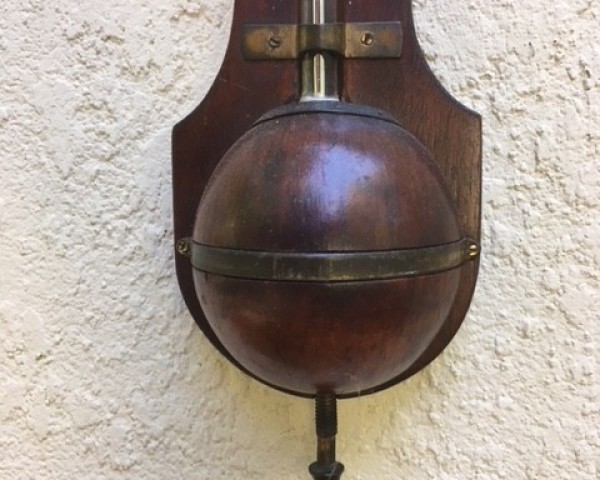 A simple round top solid mahogany stick barometer with "ivorine" plates and vernier, and alcohol thermometer. The maker is Aronsberg & Co. of Liverpool. Typical of many barometers made at this time in the late 19 th century out of solid oak, mahogany or rosewood. This one has an attractive look, with both the wood and the plates in good condition, and a nice color.