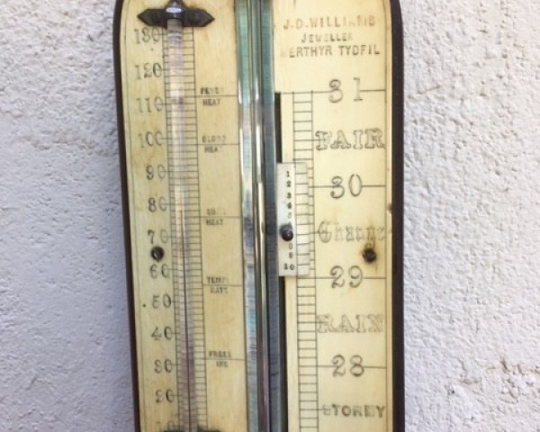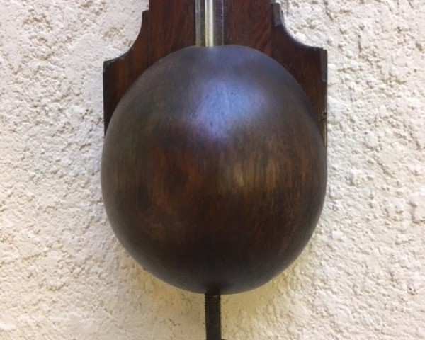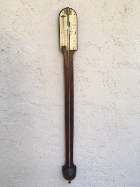 A simple round top solid mahogany stick barometer with "ivorine" plates and vernier, and original mercury thermometer. The maker is J.D.Williams of Wales. This style is typical of many barometers made towards the end of the 19 th century in solid oak, mahogany, rosewood, and occasionally cherry. I usually have a few in stock, always in fuly restored, working condition.