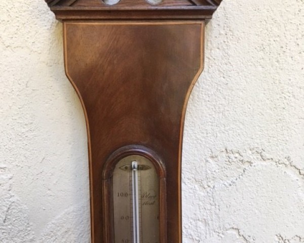 A Sheraton 3 dial mahogany veneered, mercury wheel barometer. Architectural top pediment with cast brass finial, over long alcohol thermomter, over central hygrometer. Note the small clip holding the hygrometer in place; it is made of cast brass, instead of the more usual (on 5 dial barometers) pressed brass. This is always a sign of quality. The hygrometer itself is nicely engraved, and is slightly deeper than the usual one, to go with the deeper clip.
