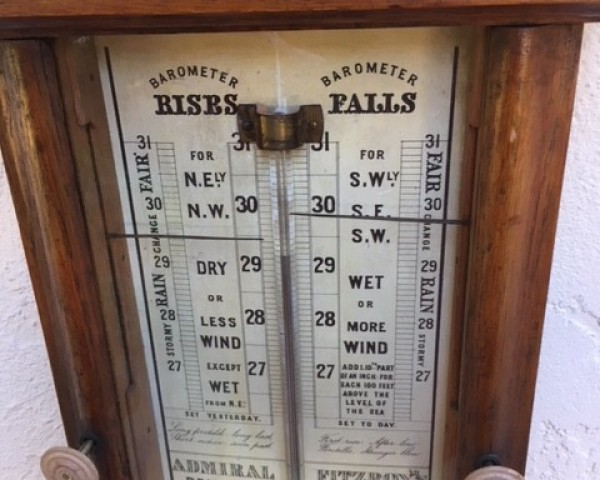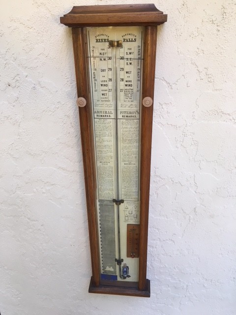 A nice example of Admiral Fitzroy's barometer, in pale oak, with all of his weather annotations. The case is of solid oak, with a paper backboard, large bore glass tube with mercury, and twin pointers operated by externally mounted knobs. There is also a round bulb alcohol thermometer. Fitzroy barometers were all made after his death, and this one dates to around 1880. He was responsible for attempting to put the World-Wide Weather on the map, by coordinating weather reports from multiple locations, in REAL TIME (long before the internet!) in London.