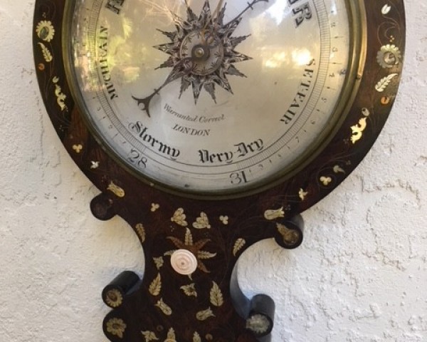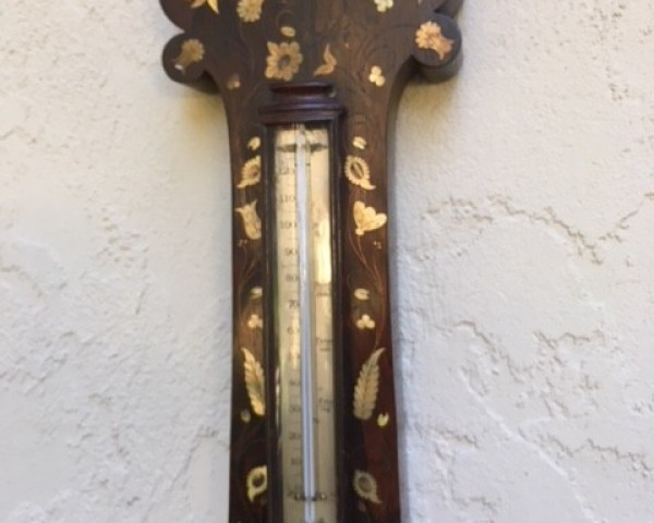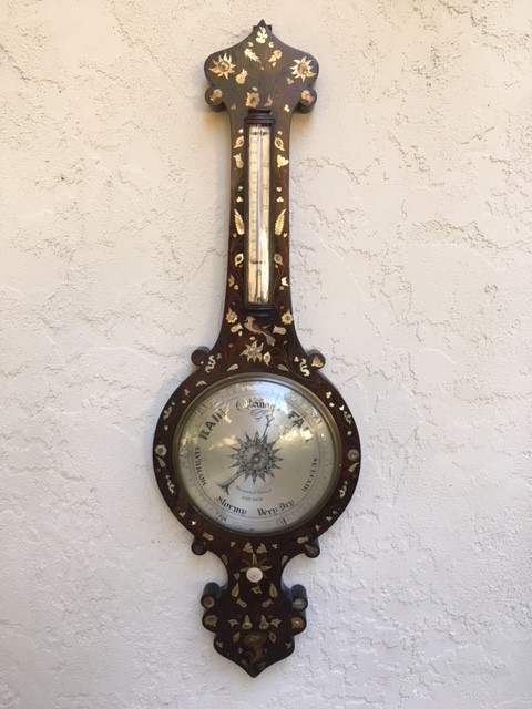 A spectacular, large dial , rosewood veneered mercury barometer, with inlays of brass, brass wire, abalone, and mother-of-pearl. The dial is 10" diameter, instead of the more usual 8"; fewer than one in twenty of all wheel barometers were 10" diameter (and one in a hundred for 12" or 6" dials). The case has a detachable bow-front mercury thermometer over the main dial, and a replaced knob beneath the main dial to operate the "set hand"; by setting the set hand (brass) to the indicating hand (steel), and seeing which way, and how far, the indicating hand moves relative to the set hand, the weather can be predicted.