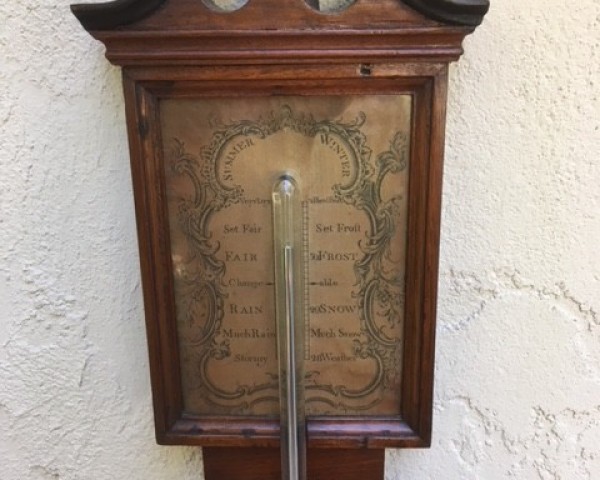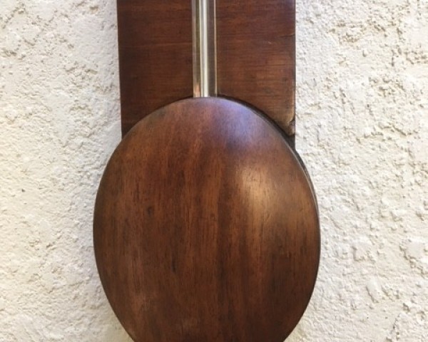 Mahogany, veneered on pine, stick with solid mahogany oval cistern cover; horizontal veneer; and a paper register plate under glass. Note the word "changeable" on the plate: this is usually an indication of pre- 1805, but in this instance is probably not. The oval cistern cover is indicative of Scottish barometers. A fine but simple stick barometer in excellent original condition, with a warm mahogany color.
