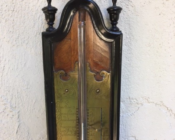 An extremely early and rare barometer, dating to around 1720-1730, with a beautifully engraved brass register plate. The barometer is French, and is made of what appears to be dark and light walnut, applied in a chevron style over a fruitwood base. The cistern container at the bottom is made from the "bole" of a tree, possibly cherry, with a wonderfully natural wood-grain showing where branches woud have originated; it is a massive, single piece of wood, hollowed out. This barometer has been in my personal collection for many years, and is being offered for sale for the first time.