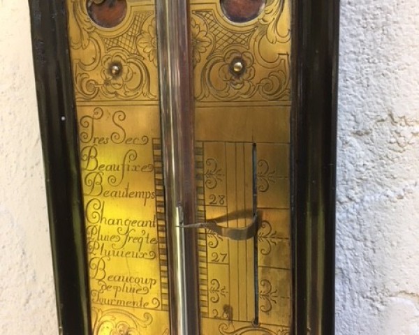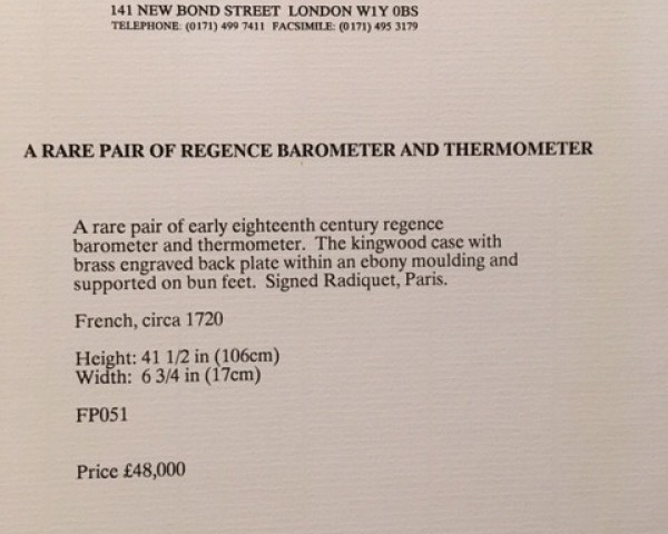 At the end of the photographs above, there is a further picture and description from the English antique dealer Mallett, from 1999, illustrating a very similar barometer and thermometer, also from France. The pair was then quoted at 48,000 pounds.