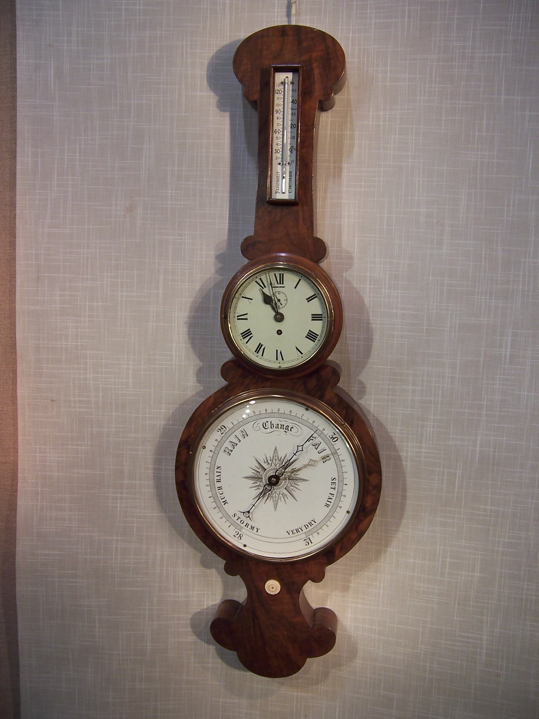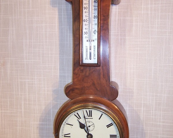 Walnut veneered clock barometer with mercury thermometer over 8 day, fusee clock, over 10" white porcelain dial, with set hand knob beneath.